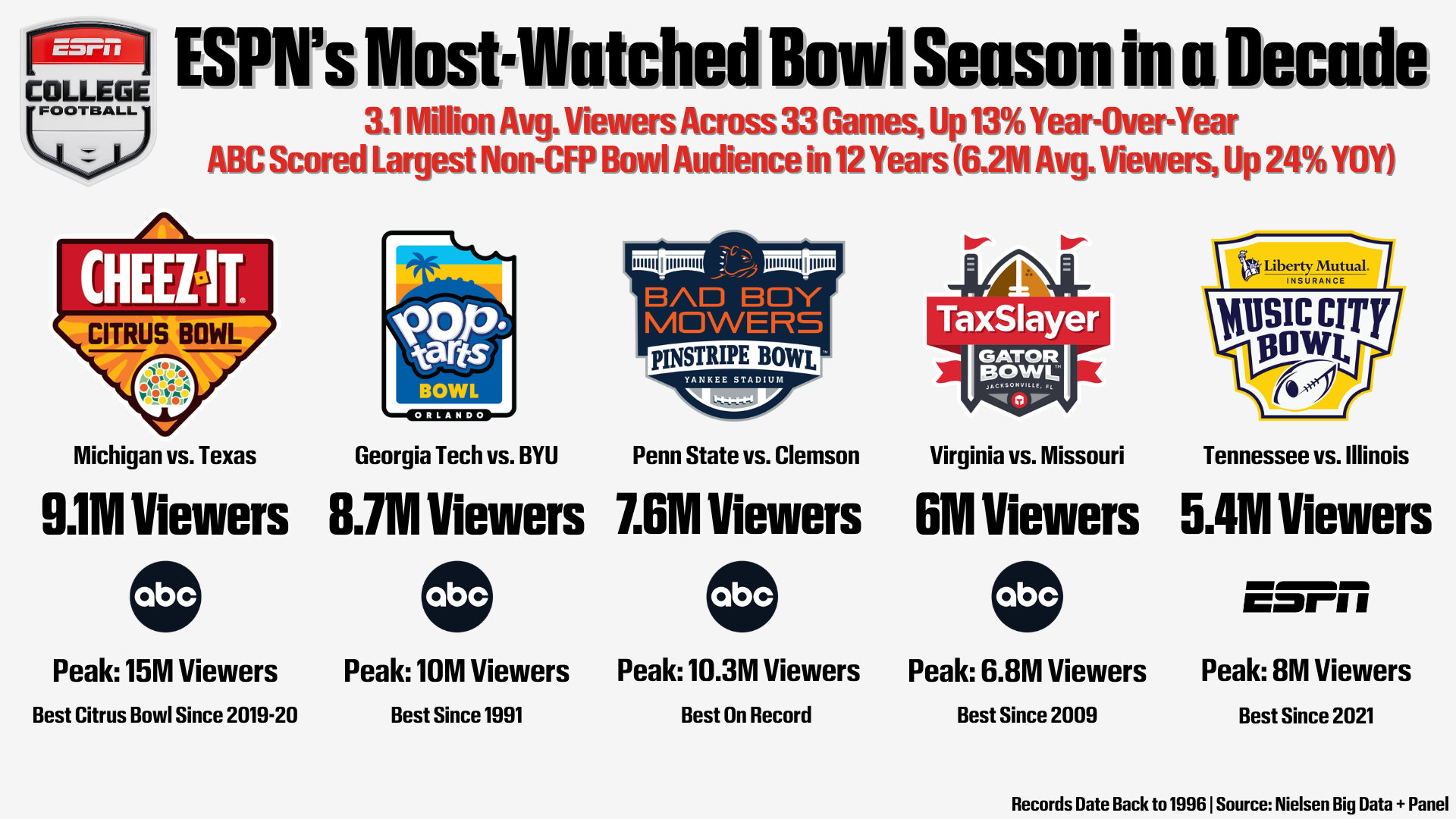 - ABC delivered its largest non‑CFP bowl audience in 12 years, averaging 6.2 million viewers across six games. All six bowls registered multi‑year viewership highs and three recorded their highest audiences in at least 10 years (Pop‑Tarts Bowl, TaxSlayer Gator Bowl and Bad Boy Mowers Pinstripe Bowl)